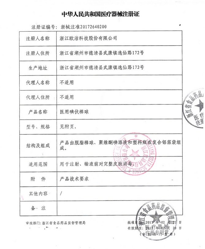 歐潔醫(yī)用碘伏棉球由脫脂棉球、聚維酮碘溶液和塑料瓶或復合鋁箔袋組成。用于注射、輸液前對完整皮膚消毒。打開包裝,取本品以注射或穿刺部位為中心,由內(nèi)向外緩慢旋轉(zhuǎn),逐步涂擦,共2次,消毒皮膚面積應≥5cm*5cm,用后棄之。