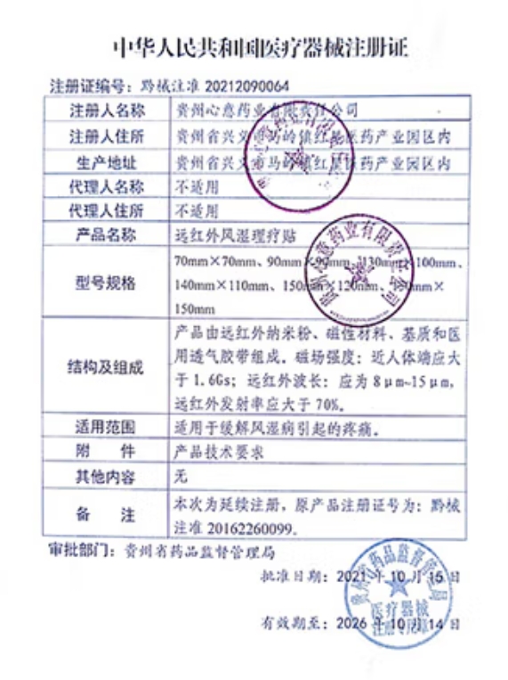 遠(yuǎn)紅外風(fēng)濕理療貼(心意)適用于風(fēng)濕病引起的疼痛。產(chǎn)品由遠(yuǎn)紅外納米粉、磁性材料、基質(zhì)和醫(yī)用透氣膠帶組成。磁場(chǎng)強(qiáng)度:近人體端應(yīng)大于1.6Gs;遠(yuǎn)紅外波長(zhǎng):應(yīng)為8μm~15μm,遠(yuǎn)紅外發(fā)射率應(yīng)大于70%。