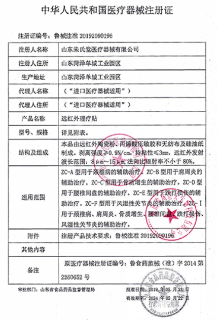 ZC-D型朱氏堂遠(yuǎn)紅外理療貼用于腰椎間盤的輔助治療。清潔患處,取出貼劑揭開防粘層,將膠面貼于患處,輕輕按壓即可,每24小時更換一次。本品由遠(yuǎn)紅外白金陶瓷粉、丙烯酸壓敏膠和無紡布及硅油紙制成。