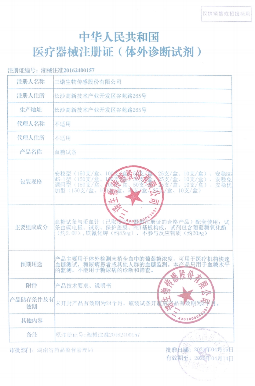 三諾安穩(wěn)血糖試條主要用于體外檢測末梢全血中的葡萄糖濃度,可用于醫(yī)療機構快速血糖測試,糖尿病患者或其他人群的血糖監(jiān)測。血糖試條與采血針(外購)配套使用。血糖試條由碳電極、試劑、保護蓋膜、PET基板構成,試劑包含葡萄糖氧化酶(約2.0U)、鐵氰化鉀(約85μg)、不參與反應物質(約20μg)。