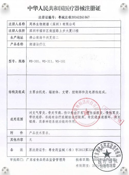 更多相關(guān):周林頻譜保健治療儀 粵食藥監(jiān)械(準)字2012第2260791號