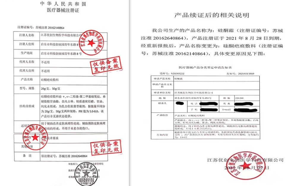 江蘇優(yōu)創(chuàng)硅酮疤痕敷料50g對(duì)應(yīng)條形碼6952007716016裝的換新包裝了,新包裝產(chǎn)品名稱及注冊(cè)號(hào)為“硅酮疤痕敷料(蘇械注準(zhǔn)20162140864)”,舊包裝產(chǎn)品名稱及注冊(cè)號(hào)為“硅酮霜(蘇械注準(zhǔn)20162640864)”。都質(zhì)量保證,新舊包裝隨機(jī)發(fā)貨