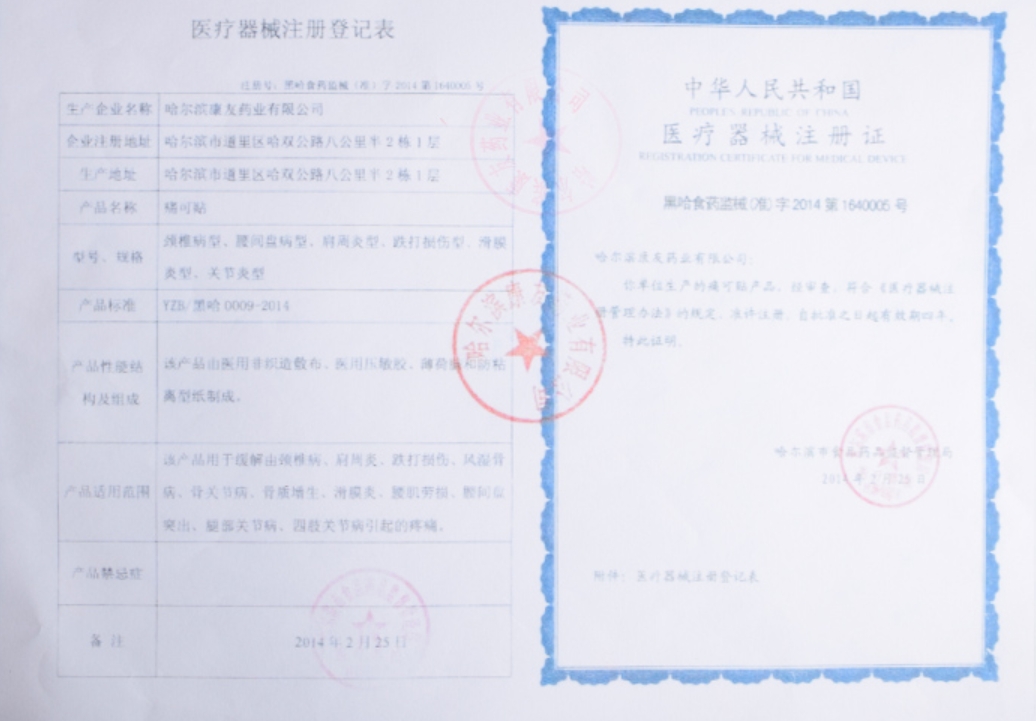 注冊(cè)證編號(hào)為黑哈食藥監(jiān)械(準(zhǔn))字2014第1640005號(hào)的痛可貼,是經(jīng)過(guò)國(guó)家食藥監(jiān)局批準(zhǔn)生產(chǎn)的產(chǎn)品,不是假的。