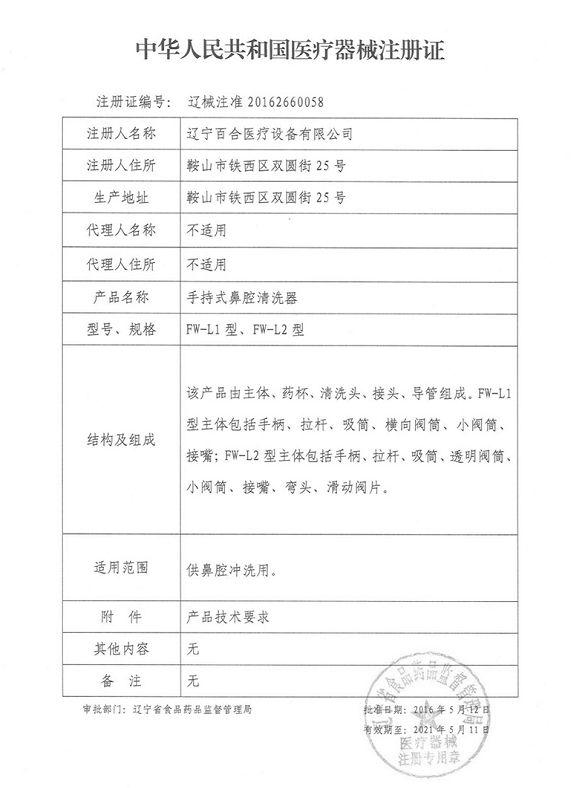手持式鼻腔清洗器產(chǎn)品性能結(jié)構(gòu)及組成由清洗頭、手柄、拉桿、吸筒、閥筒、滑動閥片、藥杯、導(dǎo)管、彎頭等組成。它通過負(fù)壓抽取藥液,再通過正壓把藥液噴到患處。最大拉力:大于20N(2Kg)小于60N(6Kg);藥杯容積:2型300ml±10%。產(chǎn)品適用范圍:適用于鼻腔疾病的輔助給藥及鼻腔的沖洗。產(chǎn)品標(biāo)準(zhǔn):YZB/遼鞍0011-2012 FW-L型手持式鼻腔清洗器。