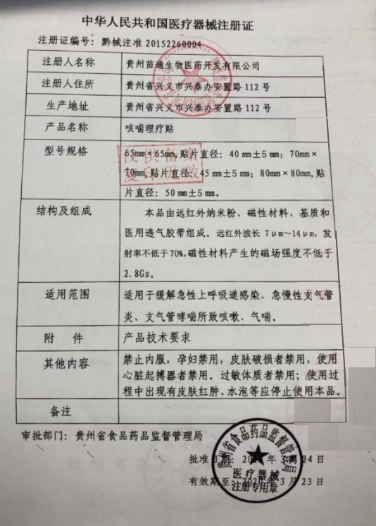 咳喘理療貼(苗通)的產(chǎn)品性能結(jié)構(gòu)及組成:本品由遠(yuǎn)紅外納米粉、磁性材料、基質(zhì)和醫(yī)用透氣膠帶組成。遠(yuǎn)紅外波長(zhǎng)7μm~14μm,發(fā)射率不低于70%,磁性材料產(chǎn)生的磁場(chǎng)強(qiáng)度不低于2.5Gs。產(chǎn)品適用范圍:適用于緩解急性上呼吸道感染、急慢性支氣管炎、支氣管炎所致咳嗽、氣喘。