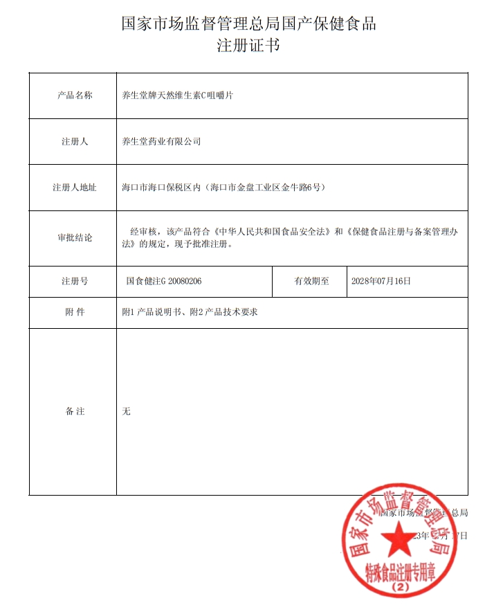 養(yǎng)生堂牌天然維生素C咀嚼片保健功能:本品經(jīng)動(dòng)物實(shí)驗(yàn)評(píng)價(jià),具有增強(qiáng)免疫力的保健功能;適宜人群:免疫力低下者;不適宜人群:3歲以下人群。每100g含:維生素C:6.21g。