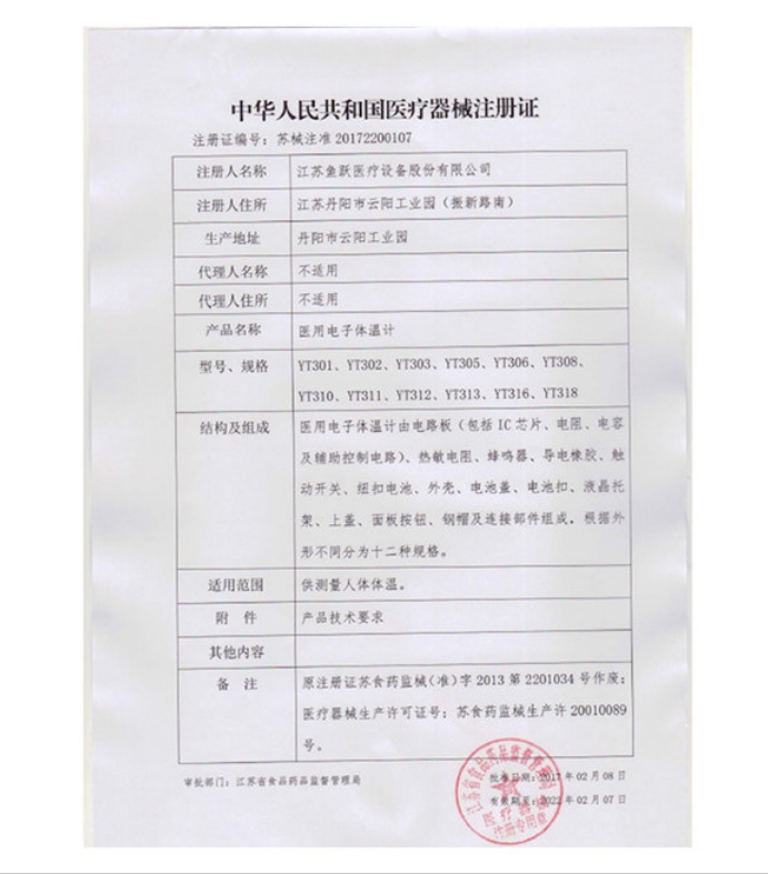 醫(yī)用電子體溫計(魚躍)供測量人體體溫。請勿將體溫計整體浸沒于水中,因為溫度計液晶顯示屏和電池蓋部分是不防水的。