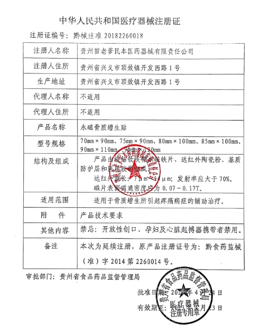 永磁骨質增生貼(苗老爹)外用,去除本品對準患處或壓痛點敷貼。適用于骨質增生所引起疼痛病癥的輔助治療。開放性創(chuàng)口,孕婦及心臟起搏器攜帶者禁用。