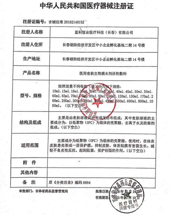 醫(yī)用愈膚生物膜(水劑活性敷料)(藍科膚寧)主要成分為低聚物(OPC)為載體的殼聚糖。使用時,在體表皮膚患處形成一層保護膜。抑制皮膚、體表粘膜有害菌生長。減輕不良炎性反應。起到阻菌,保護創(chuàng)面的作用。