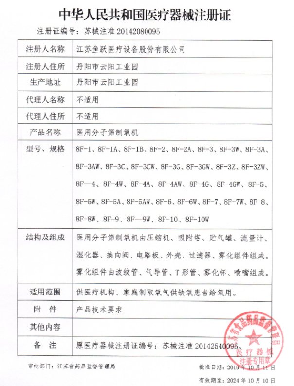醫(yī)用分子篩制氧機(魚躍)用于供醫(yī)療機構(gòu)、家庭等制取氧氣供缺氧患者給氧用。該產(chǎn)品參數(shù):出氧量:5L;氧氣濃度:93%±3%;機身重量:27Kg。