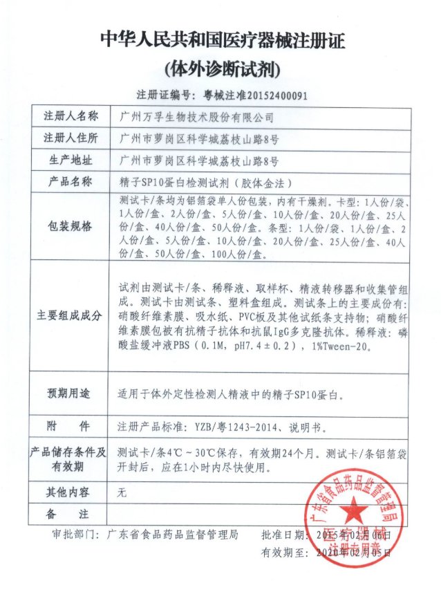 萬孚精子SP10蛋白檢測(cè)試劑(膠體金法)適用于體外定性檢測(cè)人精液中的精子SP10蛋白。4℃~30℃保存,有效期24個(gè)月。測(cè)試卡/條鋁箔袋開封后,應(yīng)在1小時(shí)內(nèi)盡快使用。