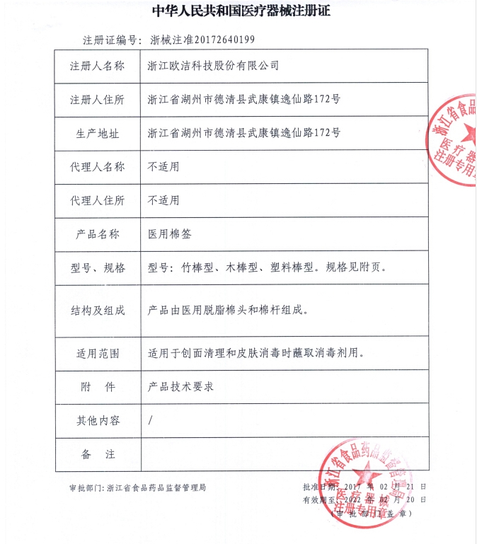 歐潔醫(yī)用棉簽由醫(yī)用脫脂棉頭和棉桿組成。歐潔醫(yī)用棉簽適用于創(chuàng)面清理和皮膚消毒時蘸取消毒劑用。產品標準:YZB/浙湖0026-2013。