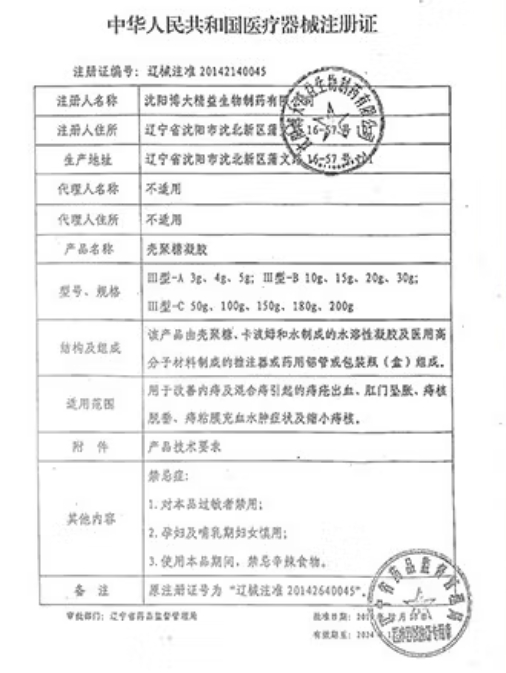 治必至殼聚糖凝膠由殼聚糖、卡波姆和水制成的水溶性凝膠及醫(yī)用高分子材料制成的推注器或藥用鋁管或包裝瓶(盒)組成。用于改善內(nèi)痔及混合痔引起的痔瘡出血、肛門墜脹、痔核脫垂、痔粘膜充血水腫癥狀及縮小痔核。