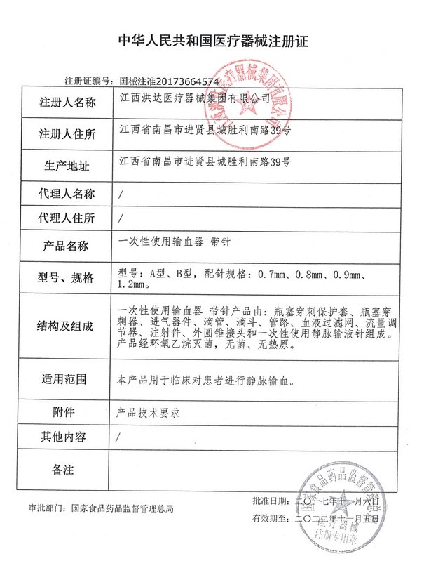 一次性使用輸血器帶針由瓶塞穿刺保護套、瓶塞穿刺器、進氣器件、滴管、滴斗、管路、血液過濾網(wǎng)、流量調(diào)節(jié)器、注射件、外圓錐接頭和一次性使用靜脈輸液針組成。產(chǎn)品經(jīng)環(huán)氧乙烷滅菌,無菌、無熱原。用于臨床對患者進行靜脈輸血。