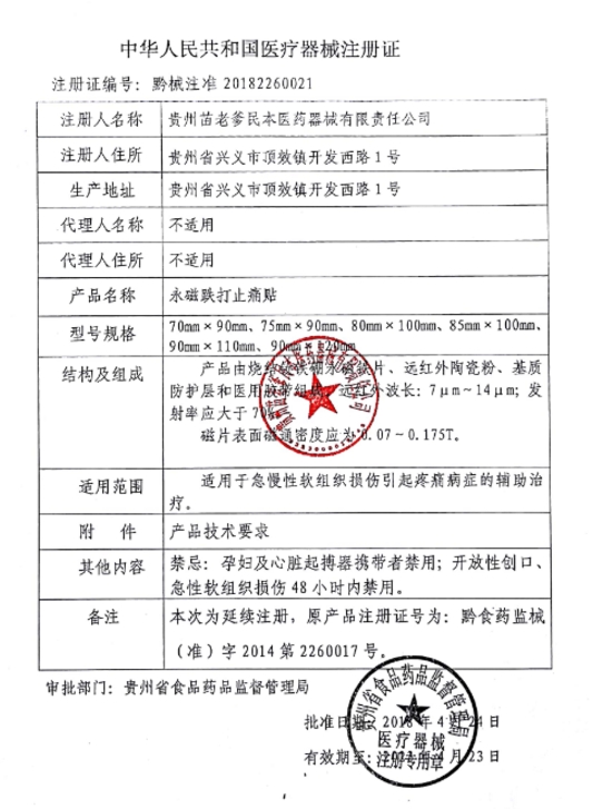 永磁跌打止痛貼(苗老爹)由燒結(jié)釹鐵硼永磁鐵片、遠(yuǎn)紅外陶瓷粉、基質(zhì)防護(hù)層和醫(yī)用膠帶組成。本品是利用遠(yuǎn)紅外線和磁場改善局部血液循環(huán),加強(qiáng)人體局部新陳代謝。人體吸收遠(yuǎn)紅外后的熱效應(yīng)使組織細(xì)胞活躍,促進(jìn)炎癥消散,從而達(dá)到消炎、消腫、止痛作用。