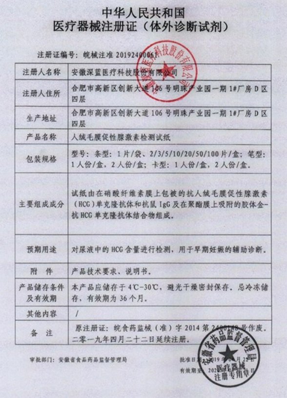 人絨毛膜促性腺激素檢測試紙(弗泰吏)由在硝酸纖維素膜上包被的抗人絨毛膜促性腺激素(HCG)單克隆抗體和抗鼠IgG及在聚脂膜上吸附的膠體金-抗HCG單克隆抗體結(jié)合物組成。對尿液中的HCG含量進(jìn)行檢測,用于早期妊娠的輔助診斷。
