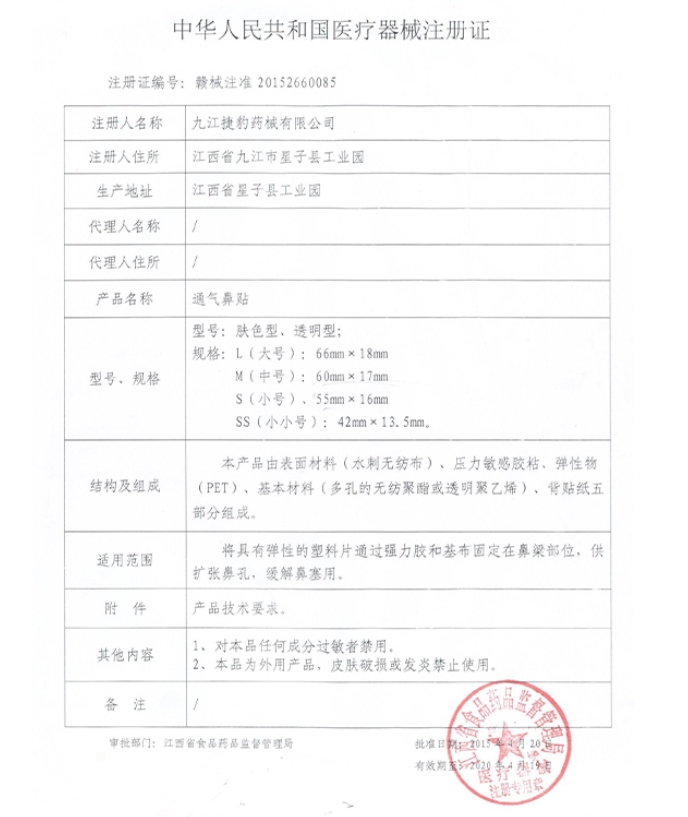 通氣鼻貼(培舒康)由表面材料(水刺無紡布),壓力敏感膠粘,彈性物(PET),基本材料(多孔的無紡聚酯或透明聚乙烯)、背貼紙五部分組成。將具有彈性的塑料片通過強(qiáng)力膠和基布固定在鼻梁部位,供擴(kuò)張鼻孔,緩解鼻塞用。每片使用一次,每天使用不超過12小時(shí),可供睡眠、運(yùn)動(dòng)、或白天使用。