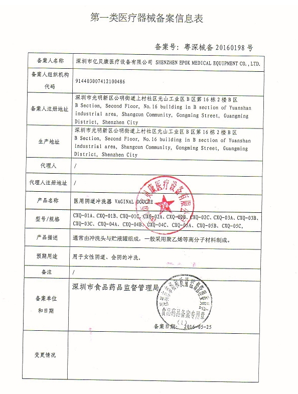 醫(yī)用陰道沖洗器(億貝康)由貯液罐、聚氯乙烯沖洗頭等部件組成。用于女性陰道、會(huì)陰的沖洗。首先將沖洗液加入貯液罐,貯液罐與沖洗頭連接;然后將沖洗頭緩慢插入陰道,擠壓貯液罐,沖洗液即進(jìn)入陰道;最后緩慢從陰道抽出沖洗頭。本品僅限個(gè)人專用,禁止不同人員之間交叉使用。