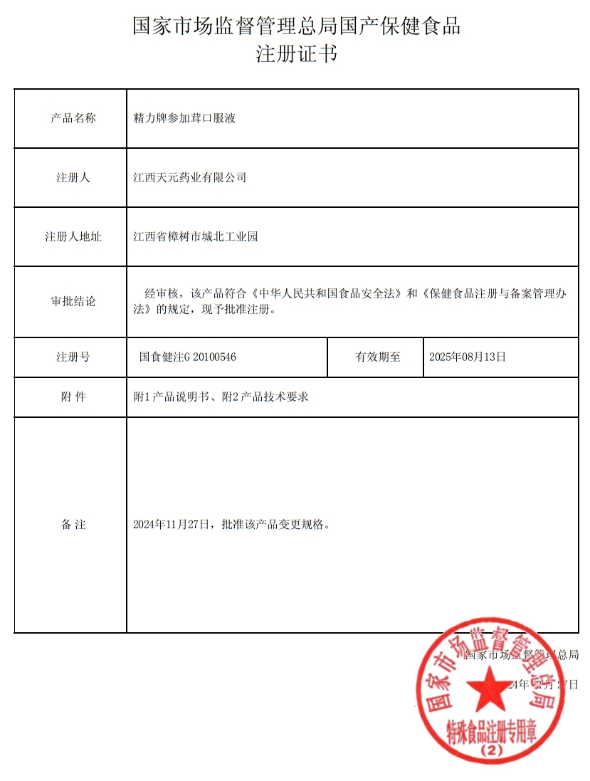 精力牌參加茸口服液(百臻堂)保健功能:緩解體力疲勞;適宜人群:易疲勞者;不適宜人群:少年兒童、孕婦、乳母。每日2次,每次1支,口服。本品不能代替藥物。主要原料為人參、熟地黃、枸杞子、肉桂、淫羊藿、馬鹿茸、白砂糖、純化水。