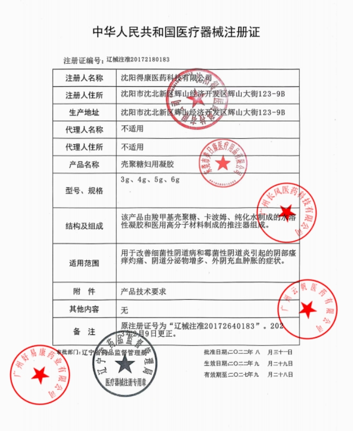 婦得康殼聚糖婦用凝膠用于改善細(xì)菌性陰道病和霉菌性陰道炎引起的陰部瘙癢灼痛、陰道分泌物增多、外陰充血腫脹的癥狀。每晚睡前,去除輔助器前端的保護(hù)帽,將裝有凝膠的推注器緩慢插入陰道深部,利用推注桿將凝膠推入陰道后,撤出推注器。
