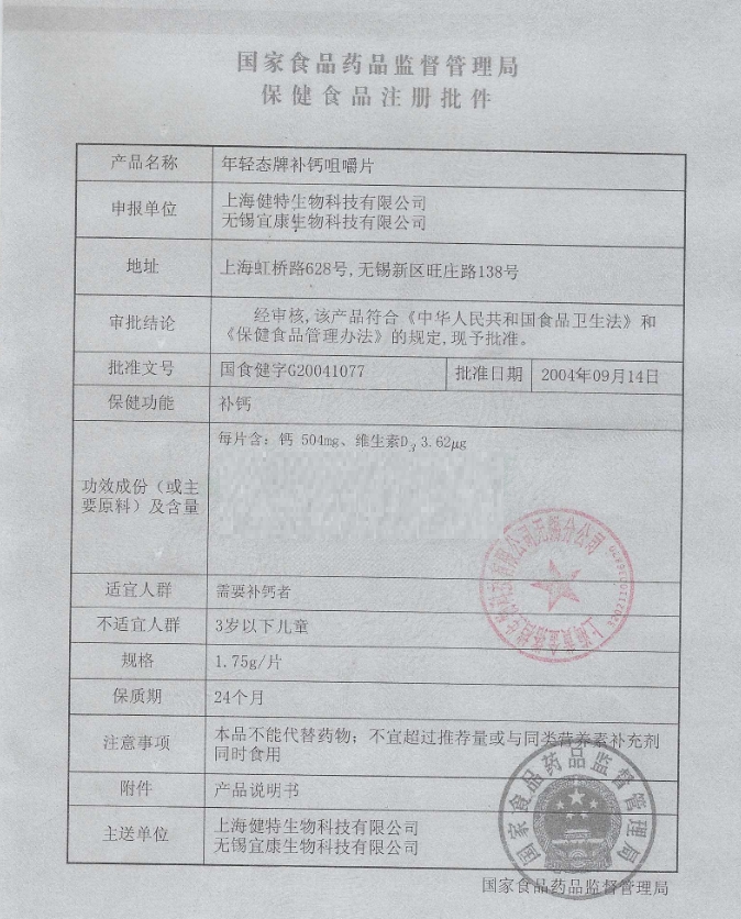 年輕態(tài)牌補(bǔ)鈣咀嚼片(禾博士)保健功能:補(bǔ)鈣;適宜人群:需要補(bǔ)鈣者;不適宜人群:3歲以下兒童。每日1次,每次1片,咀嚼后咽下。本品不能代替藥物;不宜超過(guò)推薦量或與同類營(yíng)養(yǎng)素補(bǔ)充劑同時(shí)食用。每片含:鈣 504mg、維生素D3 3.62μg。