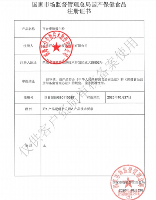 百合康牌蛋白粉(鴻洋神)保健功能:本品經(jīng)動(dòng)物實(shí)驗(yàn)評(píng)價(jià),具有增強(qiáng)免疫力的保健功能;適宜人群:免疫力低下者;不適宜人群:嬰幼兒、孕婦、乳母。每日1次,每次10g,沖服食用,附量具。