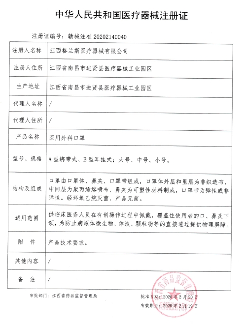 格蘭斯醫(yī)用外科口罩供臨床醫(yī)務(wù)人員在有創(chuàng)操作過程中佩戴,覆蓋住使用者的口、鼻及下頜,為防止病原體微生物、體液、顆粒物等的直接透過提供物理屏障。本品經(jīng)環(huán)氧乙烷滅菌,滅菌有效期二年,無菌單包裝破損,嚴禁使用。