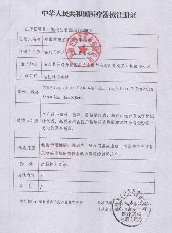 獒鼎金膏遠(yuǎn)紅外止痛貼適用于頸椎病、肩周炎、腰椎間盤突出癥、風(fēng)濕關(guān)節(jié)炎和骨關(guān)節(jié)或軟組織損傷引起的疼痛的輔助治療。外用,清潔患處后敷貼,撕開包裝袋,取出貼片,剝?nèi)シ蕾N層,將貼片對準(zhǔn)傷痛或疼痛部位,輕按整個貼片使之貼敷于皮膚上。每貼可持續(xù)使用12小時。
