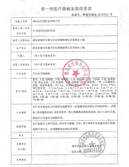 楊四郎穴位壓力刺激貼由施加壓力的球狀體或圓形體(由煉蜜和醫(yī)用高分子材料制成)、承載體(醫(yī)用橡膠制成)和醫(yī)用膠布、聚乙烯薄膜或離型紙組成,貼于人體穴位處,通過外力僅起壓力刺激作用。