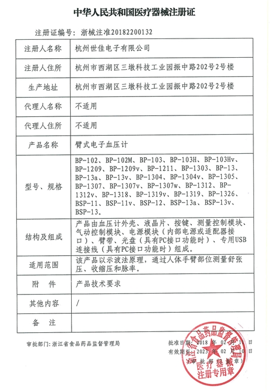 仕杰臂式電子血壓計以示波法原理,通過人體手臂部位測量舒張壓、收縮壓和脈率。嚴重心律不齊者不適用;12歲及其以下的兒童(包含新生兒及嬰幼兒)不適用。