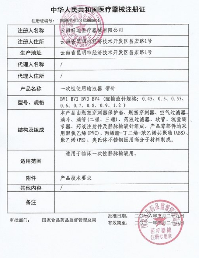 好迪一次性使用輸液器 帶針由瓶塞穿刺器保護(hù)套、瓶塞穿刺器、空氣過(guò)濾器、滴斗、滴管(二通、三通)、藥液過(guò)濾器、軟管、流量調(diào)節(jié)器、藥液注射件及靜脈輸液針組成。產(chǎn)品零部件均采用聚氯乙烯(PVC)、丙烯腈-丁二烯-苯乙烯共聚物(ABS)、奧氏體不銹鋼醫(yī)用高分子材料制成。