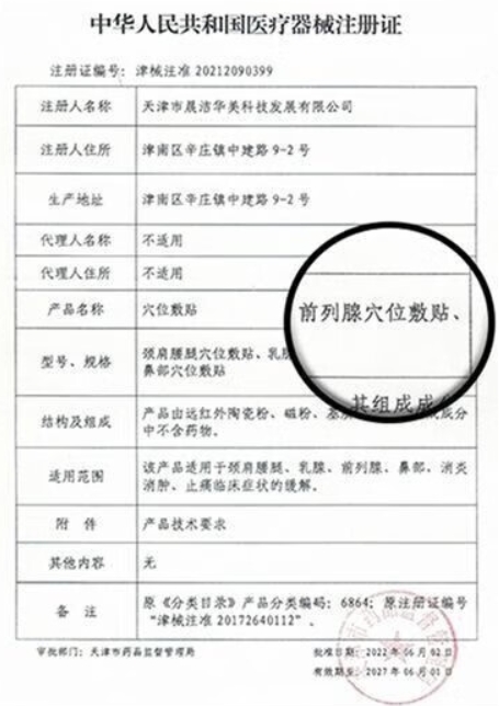 晨潔前列腺穴位敷貼由遠紅外陶瓷粉、磁粉、基質組成,其組成成分中不含藥物。適用于前列腺,消炎消腫、止痛臨床癥狀的緩解。將前列腺貼貼于氣海穴(肚臍正中直下5cm)、關元穴(肚臍正中直下10cm)、中極穴(肚臍正中直下13cm)。過敏體質者請勿使用。