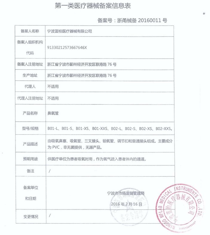 鼻氧管(MFLAB)由吸氧鼻塞、吸氧管、三叉接頭、輸氧管、調(diào)節(jié)扣和普通接頭組成。主要成分為PVC,非無(wú)菌提供,無(wú)源產(chǎn)品。供醫(yī)療單位為患者吸氧時(shí)用,作為氧氣進(jìn)入患者體內(nèi)的通道。一次性使用;使用后按醫(yī)療廢棄物處置。