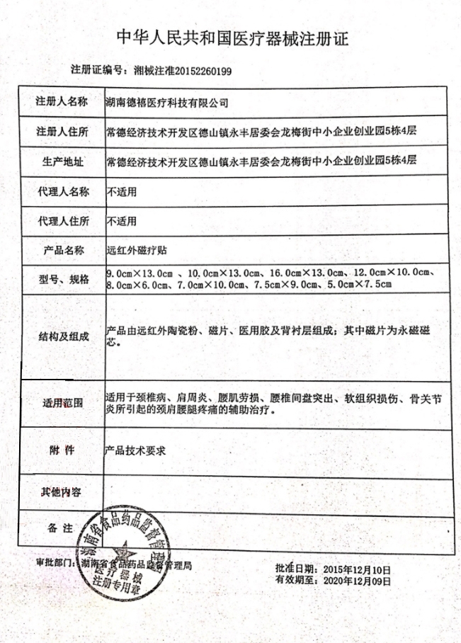 遠(yuǎn)紅外磁療貼(默氏分子針/默氏大活絡(luò))由遠(yuǎn)紅外陶瓷粉、磁片、醫(yī)用膠及背襯層組成;其中磁片為永磁磁芯。適用于頸椎病、肩周炎、腰肌勞損、腰椎間盤突出、軟組織損傷、骨關(guān)節(jié)炎所引起的頸肩腰腿疼痛的輔助治療。