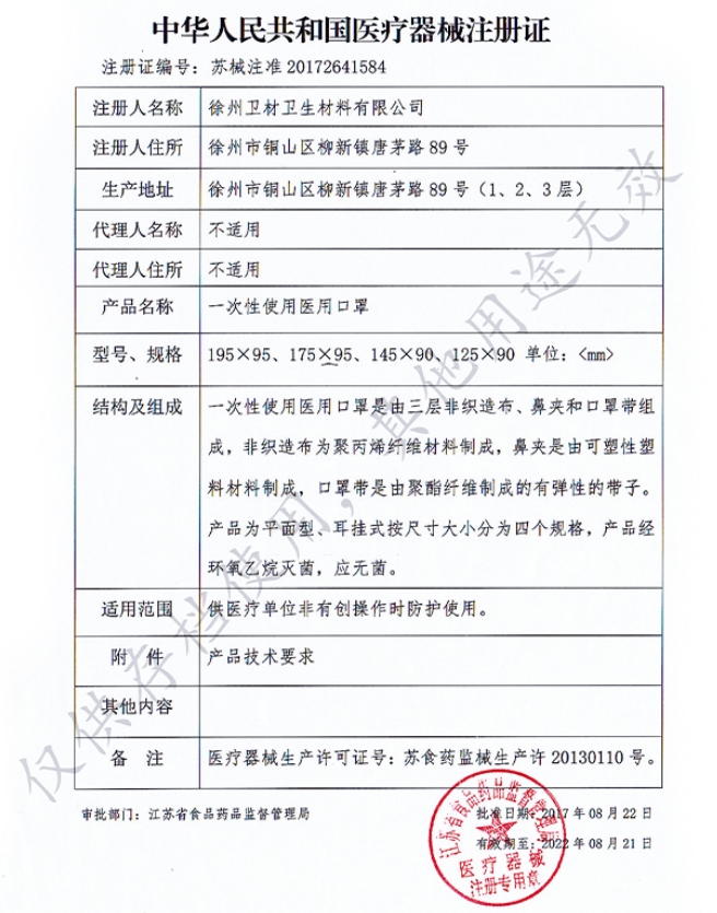 淮海一次性使用醫(yī)用口罩是由三層非織造布、鼻夾和口罩帶組成,非織造布為聚丙烯纖維材料制成,鼻夾是由可塑性塑料材料制成,口罩帶是由聚酯纖維制成的有彈性的帶子。供醫(yī)療單位非有創(chuàng)操作時防護使用。