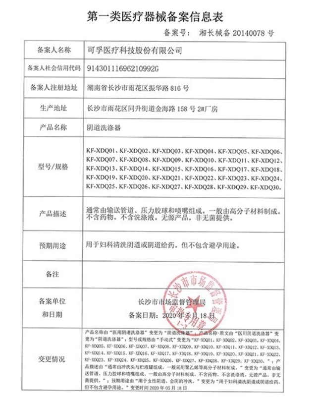 陰道洗滌器(可孚)由輸送管道、壓力膠球和噴嘴組成。一般由高分子材料制成。不含藥物。不含洗滌液。無源產(chǎn)品。非無菌提供。用于婦科清洗陰道或陰道給藥。但不包含避孕用途。使用前必須進行消毒處理,建議用生理鹽水,不可采用高溫方法消毒。