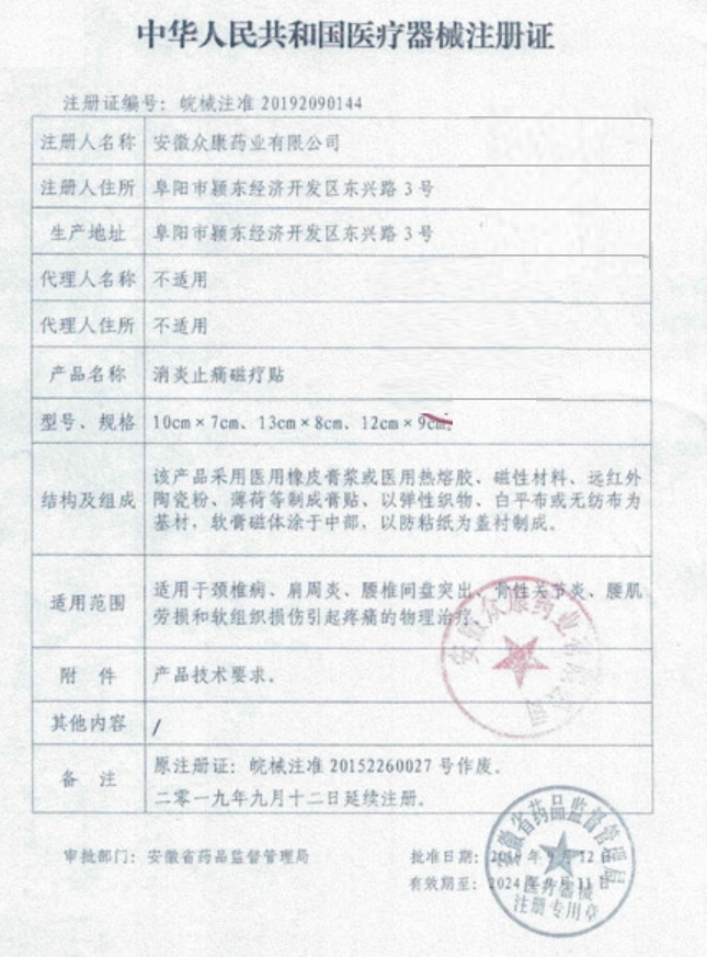 消炎止痛磁療貼(慈航)采用醫(yī)用橡皮膏漿或醫(yī)用熱熔膠、磁性材料、遠紅外陶瓷粉、薄荷等制成膏貼、以彈性織物、白平布或無妨為基材,軟膏磁體涂于中部,以防粘紙為蓋襯制成。適用于頸椎病、肩周炎、腰椎間盤突出、骨性關(guān)節(jié)炎、腰肌勞損和軟組織損傷引起疼痛的物理治療。