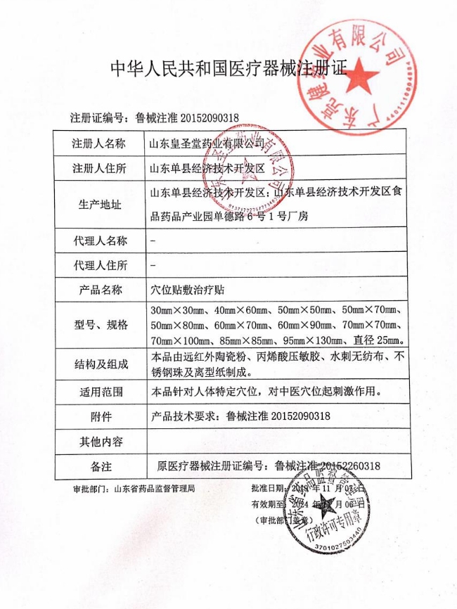 皇圣堂穴位貼敷治療貼針對人體特定穴位,對中醫(yī)穴位起刺激作用。穴位貼敷治療貼由遠(yuǎn)紅外陶瓷粉、丙烯酸壓敏膠、水刺無紡布、不銹鋼珠及離型紙制成。本品的壓敏膠布剝離強(qiáng)度不小于1.0N/cm,持粘性應(yīng)不大于2.5mm,遠(yuǎn)紅外發(fā)射波長范圍8μm-15μm,法向比輻射率≥75%。