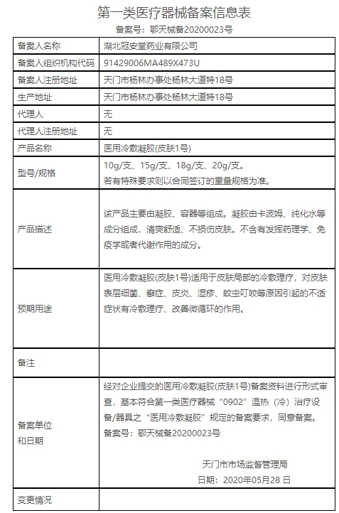 虎彤醫(yī)用冷敷凝膠(皮膚1號)由凝膠、容器等組成。凝膠由卡波姆、純化水等成分組成,清爽舒適、不損傷皮膚。不含有發(fā)揮藥理學(xué)、免疫學(xué)或者代謝作用的成分。適用于皮膚局部的冷敷理療,對皮膚表層細(xì)菌、癬癥、皮炎、濕疹、蚊蟲叮咬等原因引起的不適癥狀有冷敷理療、改善微循環(huán)的作用。