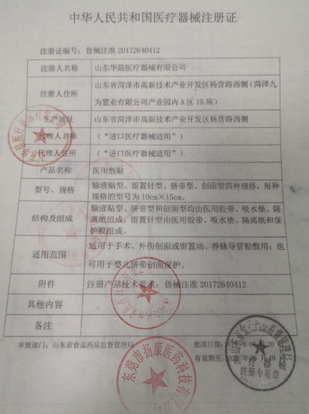 華晨醫(yī)用敷貼由醫(yī)用膠帶、吸水墊、隔離紙組成。基材為無(wú)紡布材料,隔離紙采用表面涂硅油的底紙,吸水墊采用單面復(fù)膜水刺無(wú)紡布。適用于手術(shù)、外傷創(chuàng)面或留置動(dòng)、靜脈導(dǎo)管貼敷用;也可用于嬰兒臍帶創(chuàng)面保護(hù)。