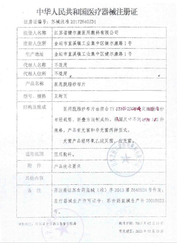 醫(yī)用脫脂紗布片(健衛(wèi)康)由符合YY0331-2006規(guī)定的脫脂紗布經(jīng)裁剪、折疊方法制成的。本品為無菌型式。無菌產(chǎn)品經(jīng)環(huán)氧乙烷滅菌,應(yīng)無菌。本產(chǎn)品為一次性使用醫(yī)療用品;本產(chǎn)品為非滅菌產(chǎn)品時(shí),使用者可根據(jù)用途決定是否滅菌后使用。