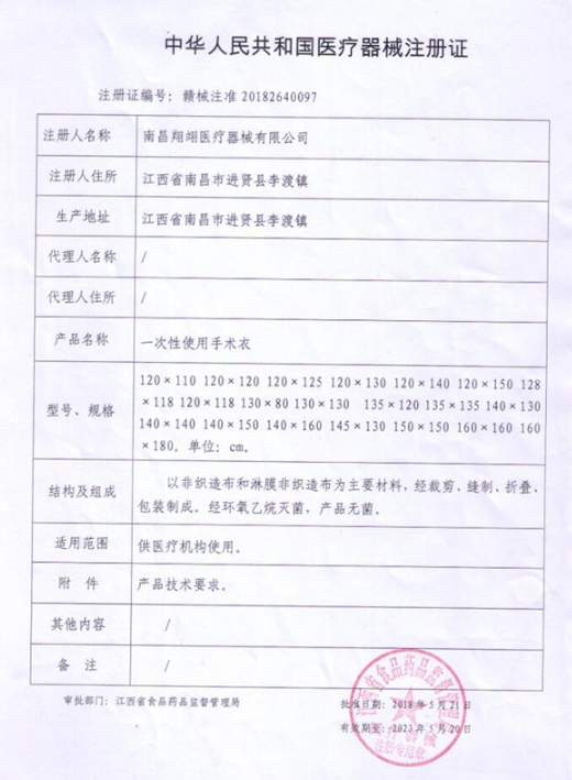 翔翊一次性使用手術(shù)衣供醫(yī)療機(jī)構(gòu)使用。本品以非織造布和淋膜非織造布為主要材料,經(jīng)裁剪、縫制、折疊、包裝制成。經(jīng)環(huán)氧乙烷滅菌,產(chǎn)品無菌。