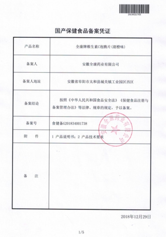 全康牌維生素C泡騰片(甜橙味)保健功能:補(bǔ)充維生素C;適宜人群:需要補(bǔ)充維生素C的4-17歲人群及成人、孕婦,乳母;不適宜人群:1歲以下人群。每日2次,每次1片,食用方法:每片用約200ml溫水或冷水溶解后飲用。不得咀嚼、含服、吞服;苯丙酮尿癥患者慎用。