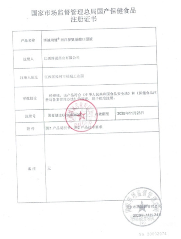博誠(chéng)瑞健®西洋參氨基酸口服液(鑫康盛)保健功能:本品經(jīng)動(dòng)物實(shí)驗(yàn)評(píng)價(jià),具有增強(qiáng)免疫力的保健功能;適宜人群:免疫力低下者;不適宜人群:少年兒童、孕婦、乳母。每日3次,每次10mL,口服。