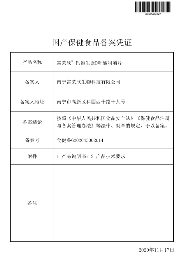 大保龍富萊欣鈣維生素D葉酸咀嚼片保健功能:補充鈣、維生素D、葉酸;適宜人群:需要補充鈣、維生素D、葉酸的成人、孕婦、乳母;不適宜人群:17歲以下人群。每日1次,每次1片;食用方法:嚼食。