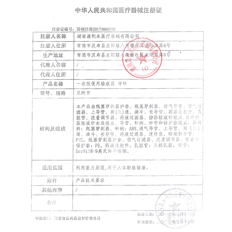 一次性使用輸液器 帶針由瓶塞穿刺器護(hù)套、瓶塞穿刺器、進(jìn)氣導(dǎo)管、空氣過濾器、上導(dǎo)管、兩(三)通、滴斗、長導(dǎo)管、藥液注射件、乳膠管、流量調(diào)節(jié)器、藥液過濾器、靜脈輸液針組成。