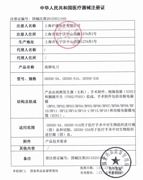 滬通高頻電刀GD350-S3A用于醫(yī)療手術(shù)中對(duì)生物組織進(jìn)行凝(固)血。產(chǎn)品由高頻發(fā)生器(主機(jī))、手術(shù)附件、絕緣容器(IC02)和腳踏開關(guān)(FS02/FS03)組成,手術(shù)附件包括雙極電凝鑷和雙極電凝鑷電纜(EC01)。