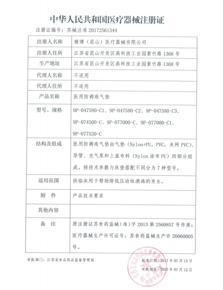 雅博醫(yī)用防褥瘡氣墊由氣墊由氣墊(Nylon+PU,PVC,夾網(wǎng)PVC)、導(dǎo)管、充氣泵和上蓋布料(Nylon涂布PU)四部分組成。供臨床用于幫助降低壓迫性潰瘍的發(fā)生。