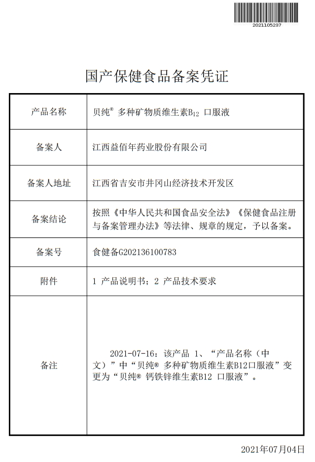 貝純多種礦物質(zhì)維生素B12口服液保健功能:補(bǔ)充多種礦物質(zhì)維生素B12;適宜人群:需要補(bǔ)充多種礦物質(zhì)維生素B12的1-17歲人群及成人、孕婦、乳母;不適宜人群:1歲以下人群。本品不能代替藥物。