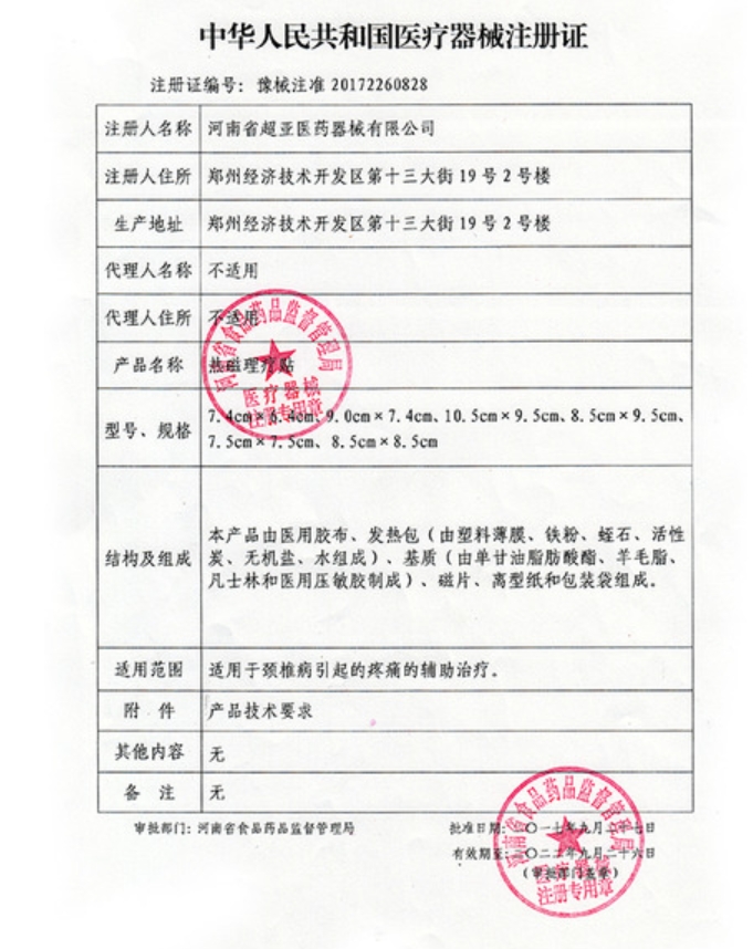 新超亞灸熱磁理療貼適用于頸椎病引起的疼痛的輔助治療。沿易撕口打開(kāi)包裝袋,揭去離型紙,對(duì)準(zhǔn)頸椎疼痛部位貼敷,每貼使用8小時(shí),一日一次,一次一貼。